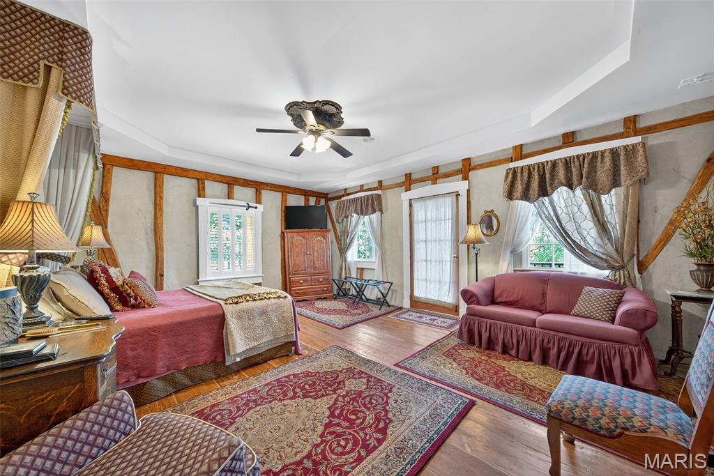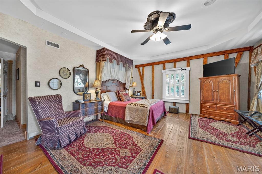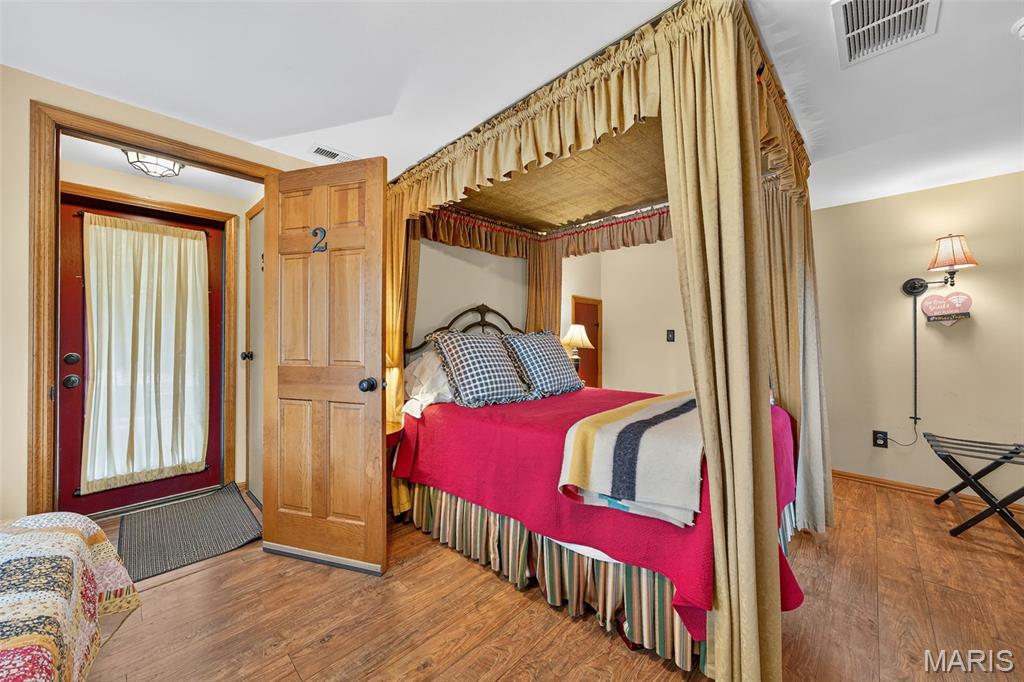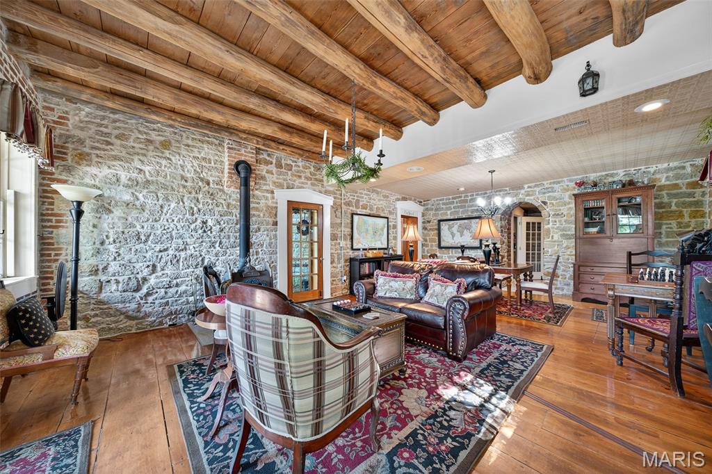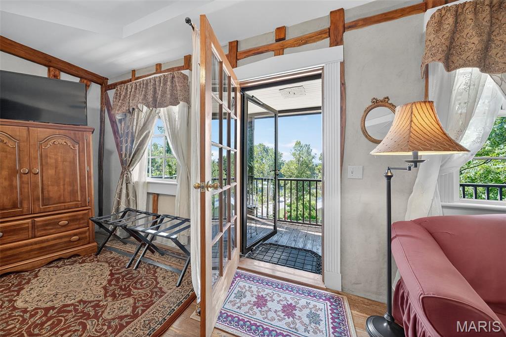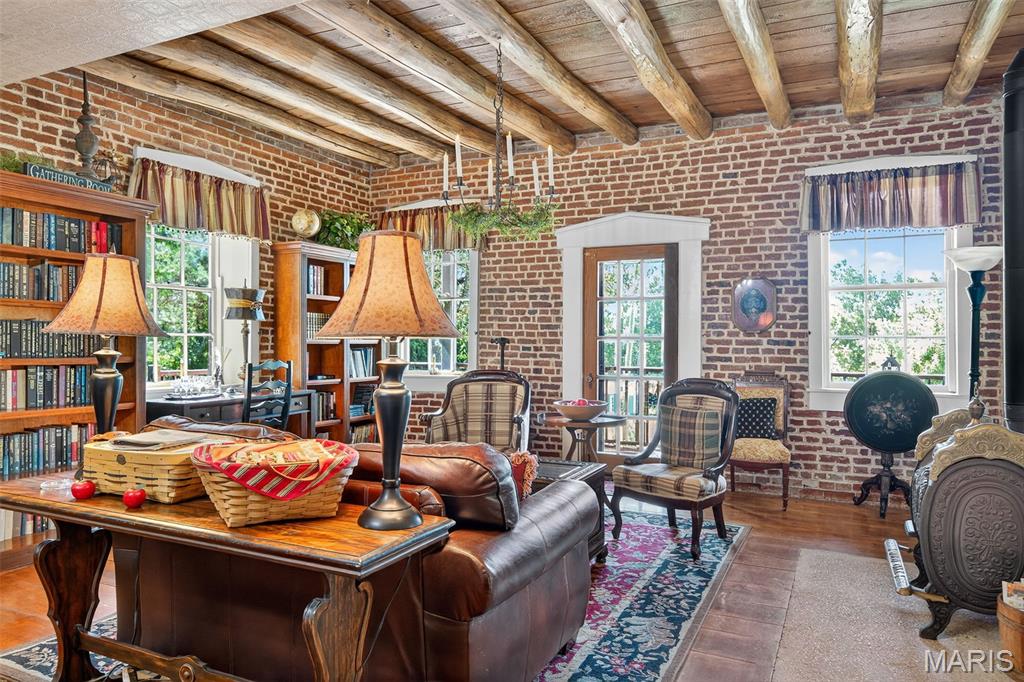 Welcome to The Applegate Inn. A beloved Bed & Breakfast (alternate use as primary residence) nestled in the heart of Augusta, Missouri, The Applegate Inn is a timeless retreat steeped in history and charm. Originally built in 1864, this beautifully preserved log cabin has seen thoughtful additions in the 1930s and 1980s, blending modern comfort with historic elegance. Much of the cabin’s original character endures—from its 24-inch stone walls and hand-hewn logs, to original brickwork, crystal door knobs, stained glass window, and authentic trim and hardwood flooring.